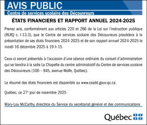 Avis public : présentation des états financiers et du rapport annuel