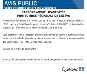 Avis public : présentation du rapport de la protectrice régionale de l’élève